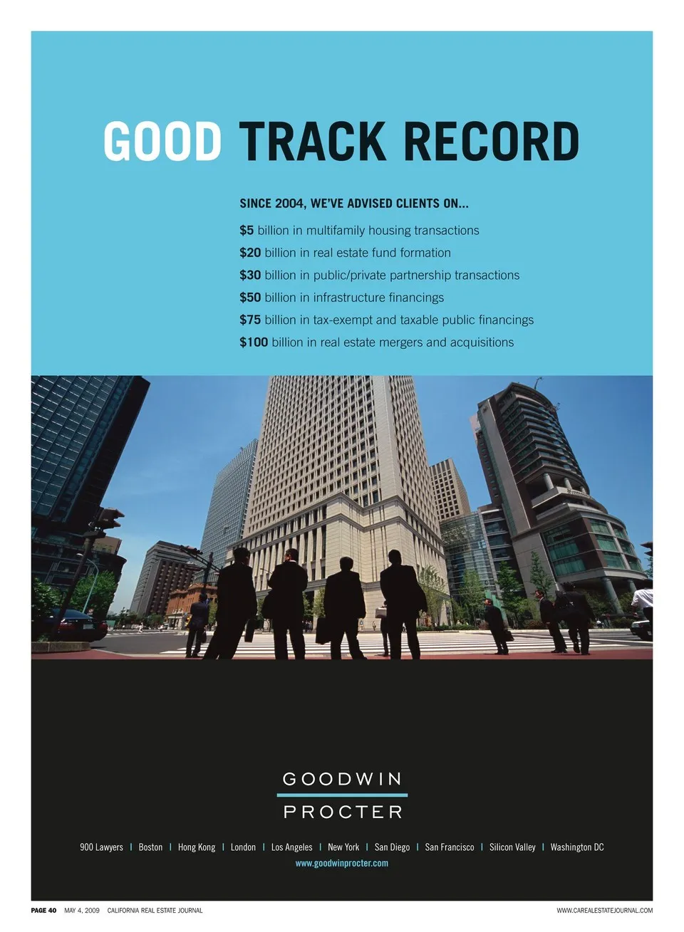 GOOD TRACK RECORD SINCE 2004, WE’VE ADVISED CLIENTS ON... $5 billion in multifamily housing transactions $20 billion in real estate fund formation $30 billion in public/private partnership transactions $50 billion in infrastructure financings $75 billion in tax-exempt and taxable public financings $100 billion in real estate mergers and acquisitions 900 Lawyers | Boston | Hong Kong | London | Los Angeles | New York | San Diego | San Francisco | Silicon Valley | Washington DC www.goodwinprocter.com PAGE 40 MAY 4, 2009 CALIFORNIA REAL ESTATE JOURNAL WWW.CAREALESTATEJOURNAL.COM